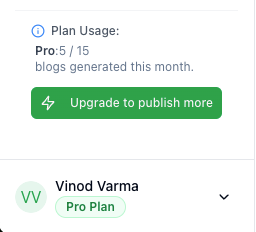 Quickly see how many AI-generated blogs you’ve used this month—and when you’re approaching your plan limit. Stay in control of your quota and know exactly when to upgrade.