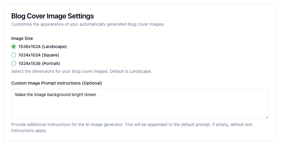 Pick the perfect dimensions (landscape, square or portrait) and append custom prompts—like “bright green background”—to get on-brand cover images every time.