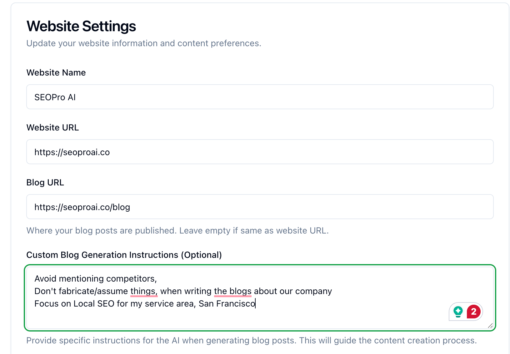 • Define voice, tone, and focus—e.g., “Avoid competitor mentions,” “Emphasize local SF SEO,” or any custom instruction