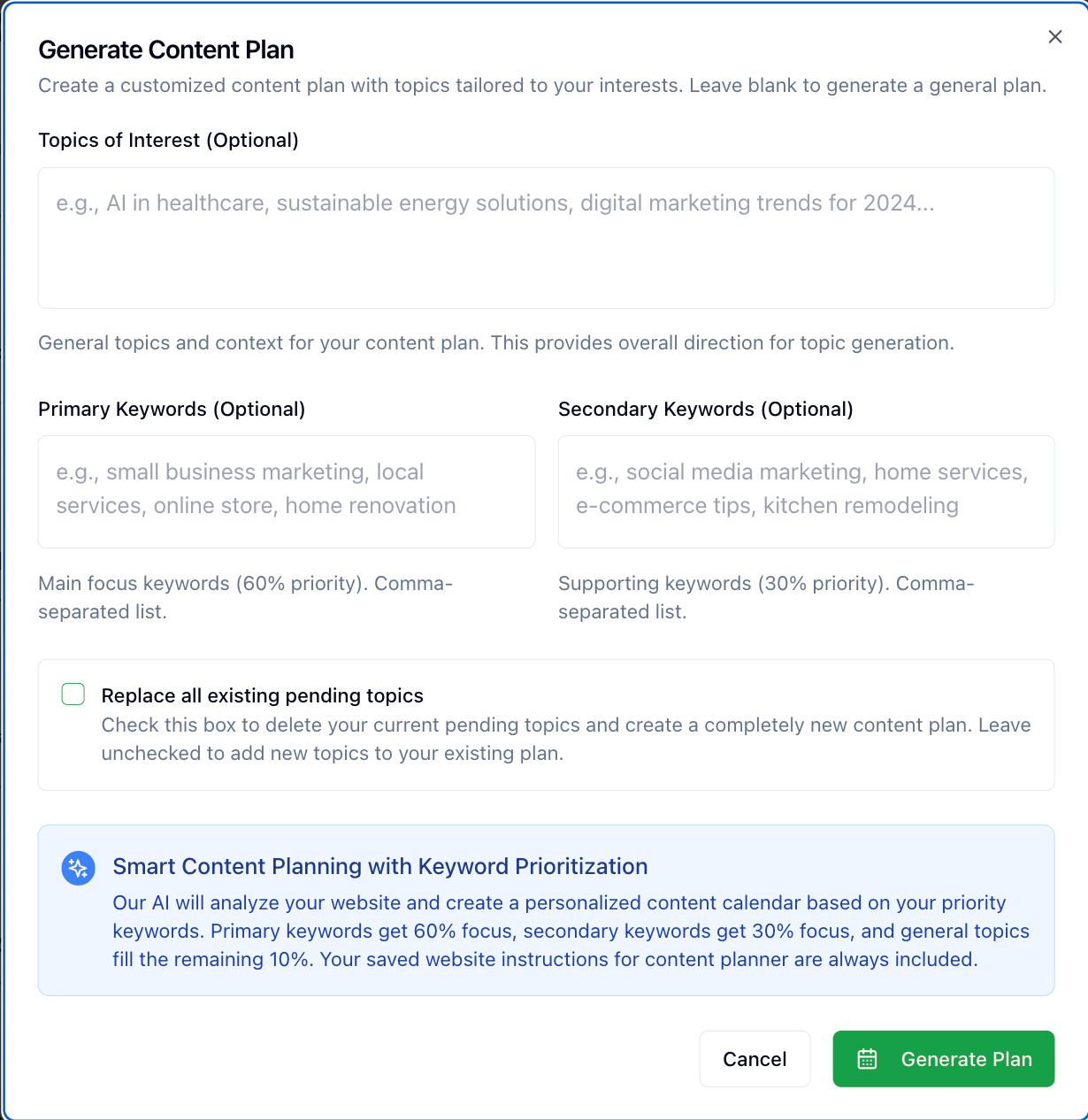 • Primary keywords receive 60% focus, secondary keywords 30%, and general topics fill the remaining 10%
